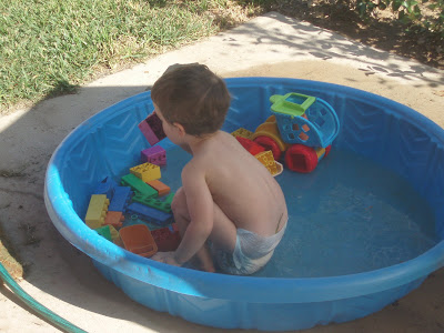 Elijah playing in the pool. He was so excited to go swimming he wouldn't even take his diaper off. Notice the sagging. Oh, and yes, that's a blade of grass sticking out of his diaper. I used to ask myself how these things happen (where do you get grass in a swimming pool?) but now I have come to know he's a boy and these things just happen.